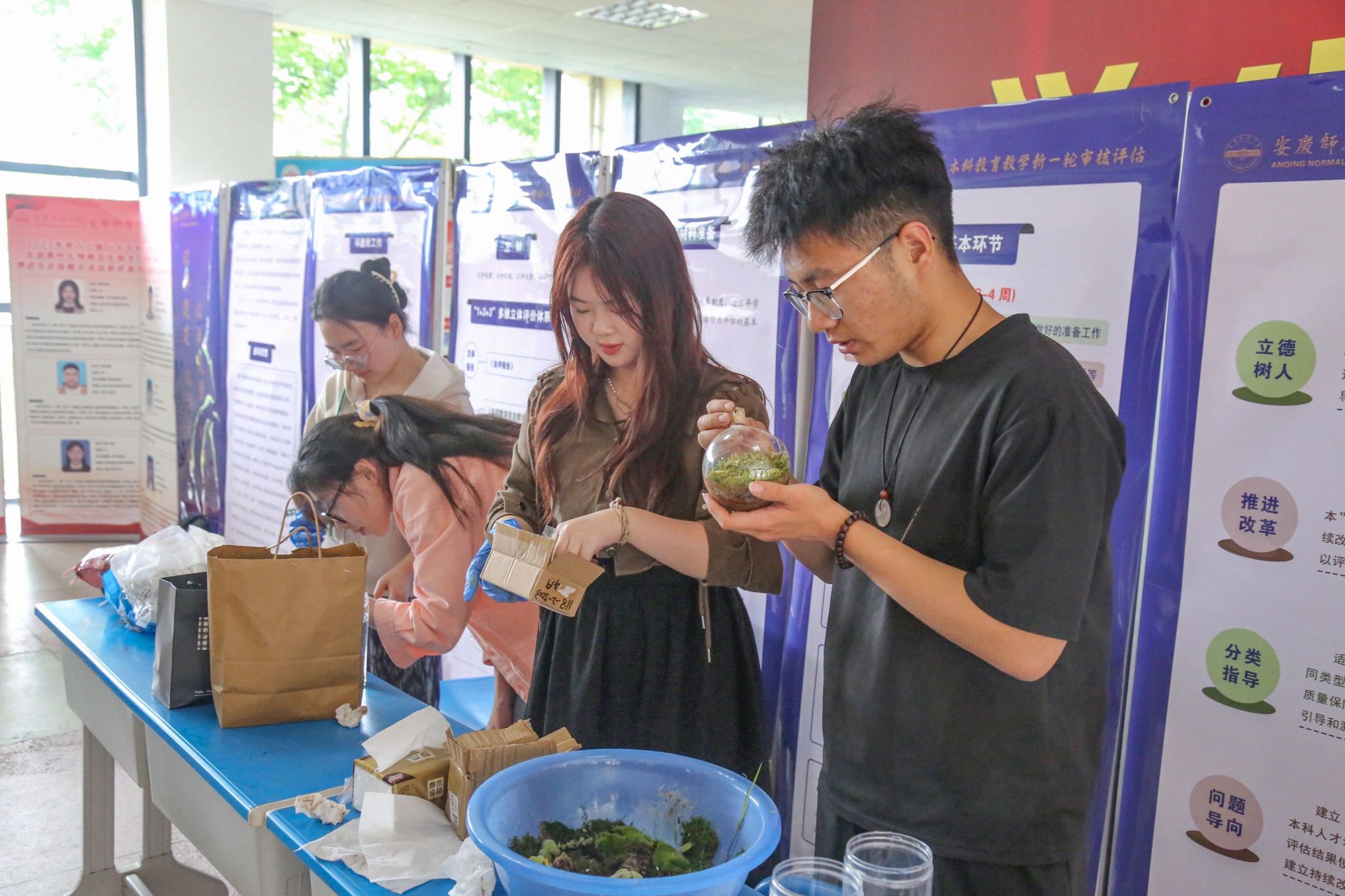 丛丛绿意的苔藓缸,独立坚韧的多肉缸,灵活生动的鱼群缸……通过填充设计装饰,透明缸罐“摇身一变”成为了一个个精致的生态缸,让路过的学生频频驻足观赏。“亲自动手制作生态缸,一方面有助于大学生深入了解生态系统运作机制,通过动手搭建可以观察到在有限的空间内生物如何共同生存,另一方面有利于提高审美情趣,发挥个人创意,在动手的过程中放松心情,释放压力。”活动负责人、生物科学类专业2023级7班的张紫依表示。