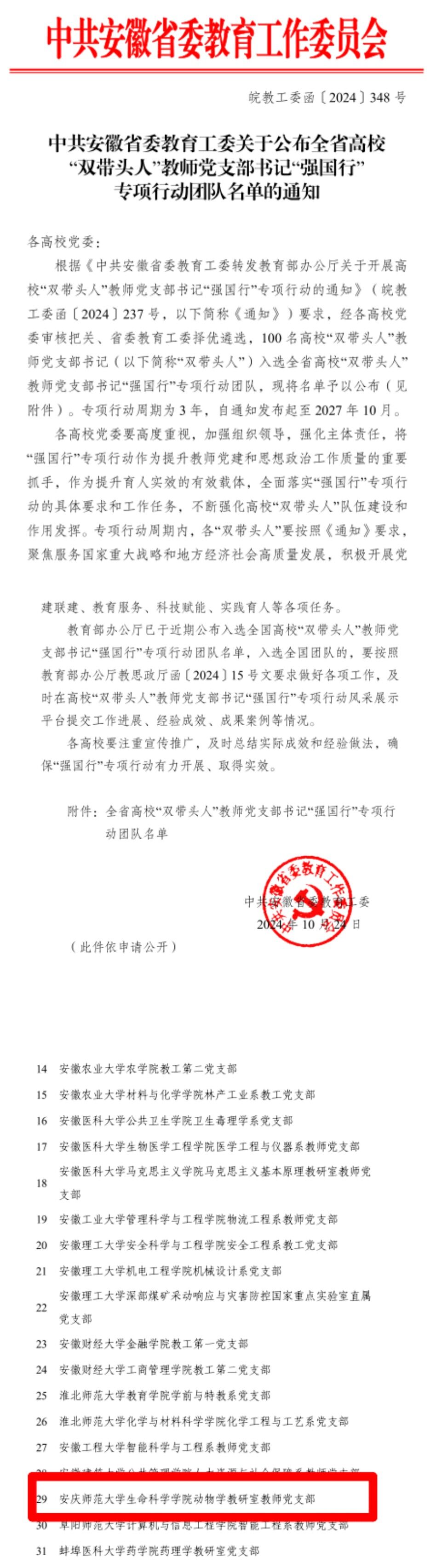 近日,省委教育工委发布中共安徽省委教育工委关于公布全省高校“双带头人”教师党支部书记“强国行”专项行动团队名单的通知,学院动物学教研室教师党支部入选。