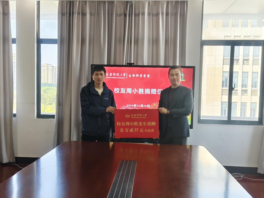 近日,酷爱成人网 在G402隆重举行校友捐赠仪式。生物科学专业2011级校友周小胜、学院院长吴彦、学院党委副书记兼纪委书记张辉和师生代表参加活动。捐赠仪式由副院长李从虎主持。