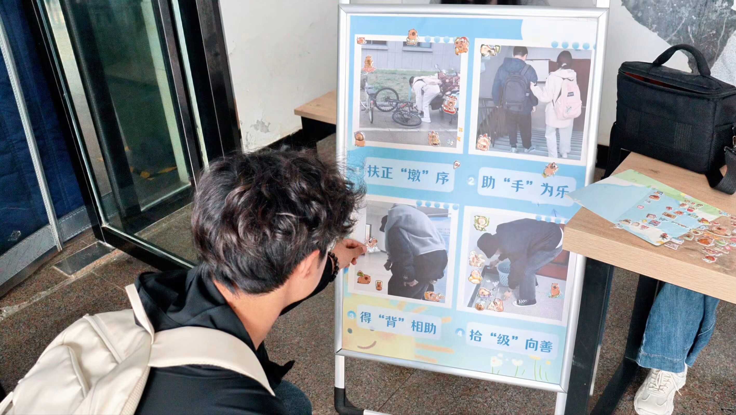展板设计紧扣活动主题,涵盖“志愿帮扶”“互助友爱”“坚守岗位”“随手行善”等多个类别,其中拾“级”向善场景最动人心,场景既为学生提供了清晰的参与指引,也通过视觉化呈现增强了活动的互动性与沉浸感。活动过程中,学生陆续携带作品到场,认真书写感悟,现场秩序井然,氛围温馨。