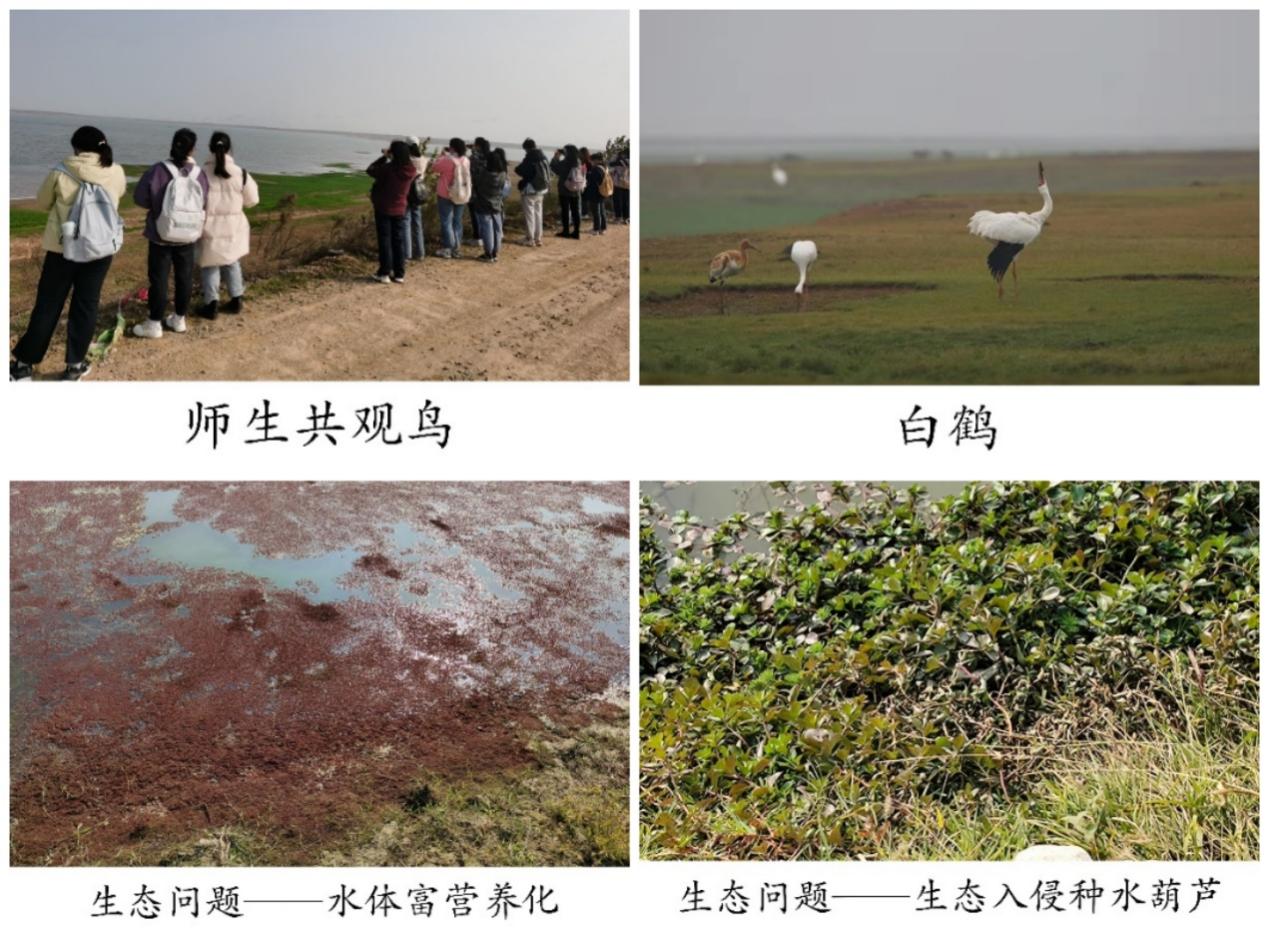 在指导老师的带领下,学生们首先参观了菜子湖湿地科普宣教馆。通过科普宣教管工作人员的详细介绍,学生们了解掌握了湿地的重要性以及湿地植物和动物的种类,尤其是对鸟类的物种多样性留下了深刻的记忆。参观完标本馆后,全体师生们前往菜子湖国家湿地公园的核心区,进行鸟类的观赏和生态环境问题的调研。同学们在老师的指导下,纷纷对栖息在菜子湖的候鸟进行观赏和分类。生态学专业同学们对菜子湖周边的生态环境问题进行了调研,发现了湿地退化、农业污染严重、生态入侵物种水葫芦、以及水体富营养化等生态问题。在观赏和调研过程中,同学们手拿塑料袋,围绕着菜子湖边,捡走散落在各处的生活垃圾,为湿地的清洁美丽作出自己的贡献,用实际行动践行环保理念。