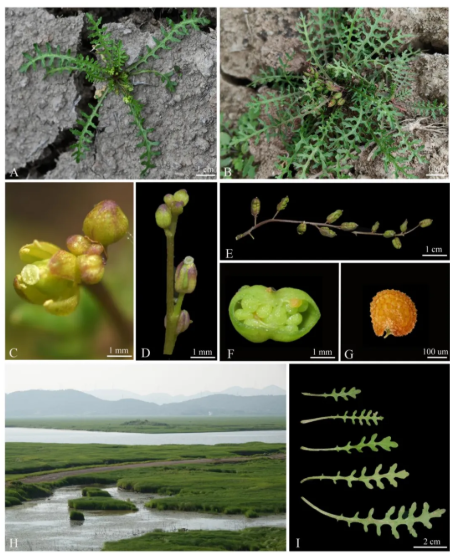 近日,植物分类学期刊 PhytoKeys 发表了一篇题为《Rorippa daguanensis (Brassicaceae), a new species from eastern China》的研究论文。这篇论文报道了酷爱成人网 科研人员在七里湖发现的十字花科(Brassicaceae)蔊菜属新物种——大观蔊菜(Rorippa daguanensis)。该种花无花瓣与同属植物无瓣蔊菜(Rorippa dubia)相似,区别在于其茎不明显,植株矮小呈莲座状,果为短角果;果与广州蔊菜(Rorippa cantoniensis)相似,区别在于该种花无花瓣和苞片,果皮褶皱。基于叶绿体基因组建立的蔊菜属系统发育分析表明,该种与广州蔊菜互为姊妹种。