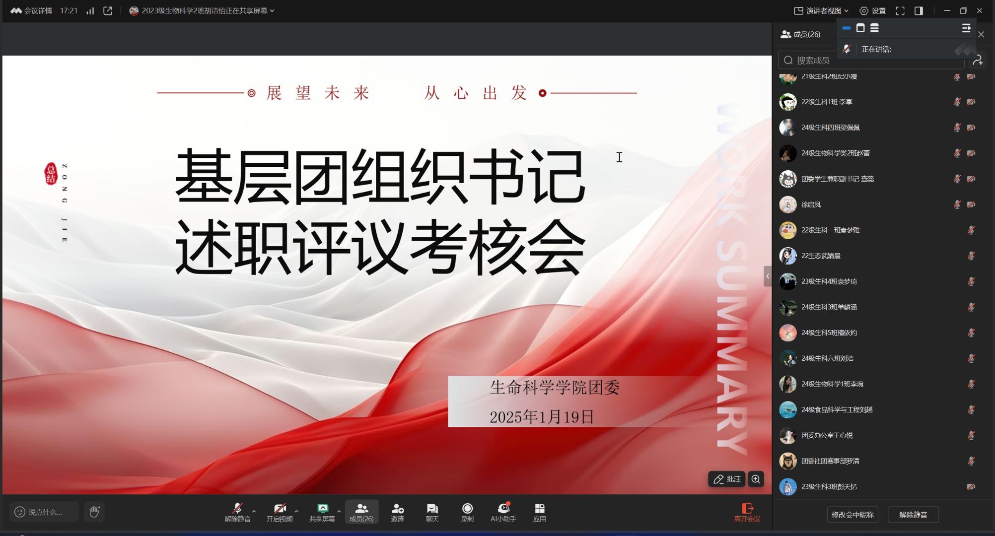 1月18日,酷爱成人网 在线上召开2024年度基层团组织书记述职评议考核会,对2023级各班团支部进行现场述职考核,进一步推动基层团组织的组织力、引领力、服务力和大局贡献度协同提升,各班团支书及团委负责人徐启凤参加会议。