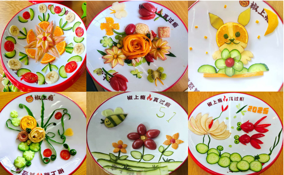 在水果拼盘设计环节中,15组参赛选手各显神通。比赛现场,有的团队以“游龙舟”为主题,将黄瓜切成小片作鳞片,拼接成龙身,黄瓜雕出龙头,苹果切成小船;有的团队打造出“熊猫攀竹”,用黄瓜巧妙雕出竹竿,苹果片和黄瓜皮垒出小熊猫……不同的水果拼盘作品在学生们手中诞生。