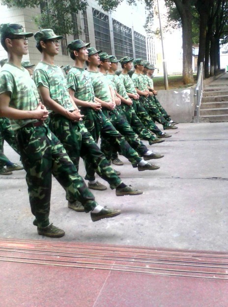 在教官的严格指导下,13级新生军训第一天进行了军姿训练,立正稍息、齐步走。烈日骄阳下,要绷紧全身,笔直的站立三四十分钟并不是件容易的事情。“不一会儿,腿就开始僵硬,身体来回倾斜。最受罪的就是腿脚了,每天都会酸疼。”4连的一位男生说道。“站军姿的时候就想蹲着,练习蹲姿的时候就想站着,其实都一样难坚持,腿都会很疼。”6连的一位女同学笑着说。训练的时候教官会照顾一些体质较弱的同学,但总有嫌累的同学想趁机偷懒,却还是躲不过教官的“火眼金睛”,绝不给任何一个偷懒者机会。军训是苦的、累的,同样也是充满快乐的——在休息间歇,严格的教官也变得可爱起来,教学生唱起《军中绿花》、《团结就是力量》等高亢的军歌,和同学们做起了游戏,甚至还应男生的要求教他们擒拿术······操场上到处飞扬的歌声,呐喊声,欢笑声,凝聚成一首充满青春活力的特殊旋律。