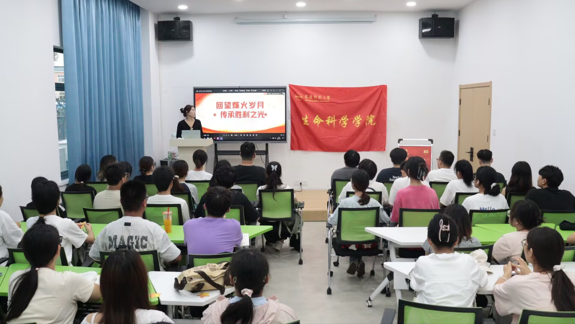 在活动第一阶段,主持人播放了抗战胜利历史片段,25分钟的视频浓缩了从1937年以来中国人民为寻求人民独立和民族解放的光辉历程。九一八事变后,日本侵占中国东北;七七事变爆发,全面侵华开始。中国军民浴血奋战,付出巨大牺牲,最终在世界反法西斯同盟支持下取得彻底胜利。这是近代中国首次赢得完全胜利的民族解放战争,奠定了中华民族伟大复兴的历史基石。一幕幕历史的片段将大家的思绪带到了那段战火烽飞的年代,无数革命先烈抛头颅、洒热血,以生命守护生命,用信念点燃信念。现场,不少同学的眼角泛起了阵阵泪光。