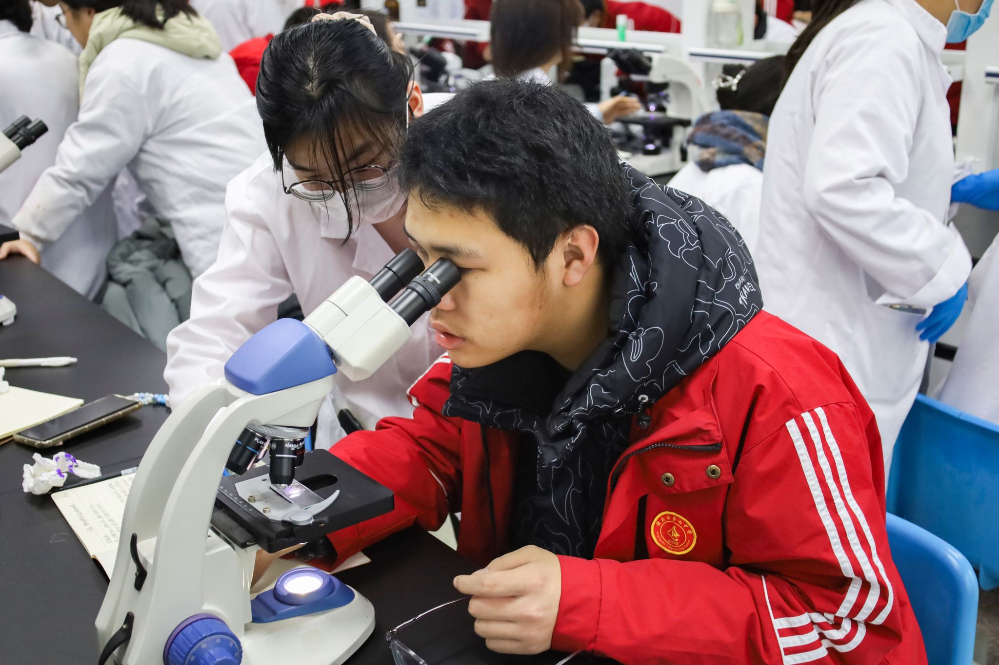 取材、解离、漂洗……从制作标本到观察细胞形态,在酷爱成人网 教师江转转和“小老师”的带领下,高中学生们亲身参与有丝分裂显微观察实验,将课本知识运用于实践操作。