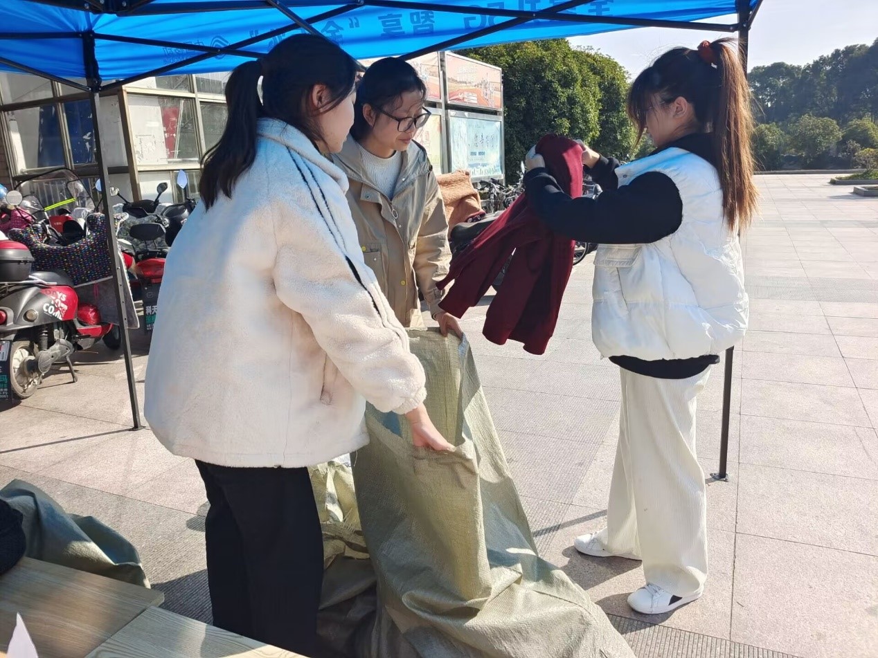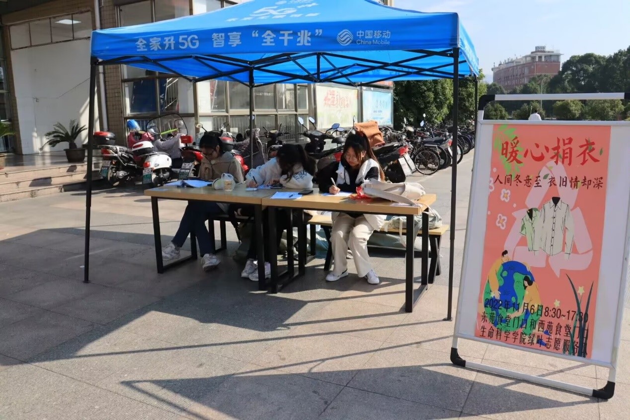 11月6日,酷爱成人网 绿叶志愿服务队在东苑食堂、西苑食堂门口开展“迎冬捐衣,传递爱心”活动,收集学生们的闲置衣物,捐赠给贫困地区的孩子和贫困学生,进一步培养大学生助人为乐的精神。