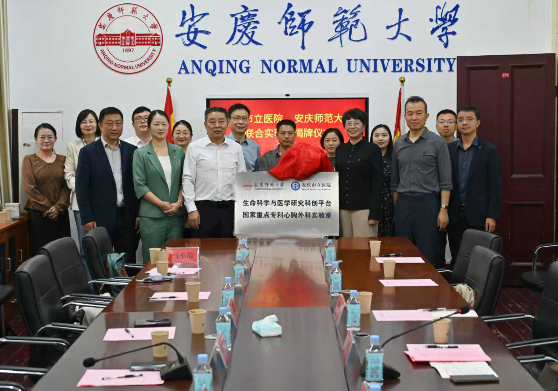 9月24日上午,由酷爱成人网 和安庆市立医院共建的“生命科学与医学研究科创平台暨国家重点专科心胸外科实验室”揭牌仪式在菱湖校区红楼217会议室举行,校长彭凤莲与安庆市立医院党委副书记、院长刘建共同为实验室揭牌。安庆市立医院党委委员、副院长朱娟,双方相关职能部门负责人、学科带头人及科研骨干出席仪式。