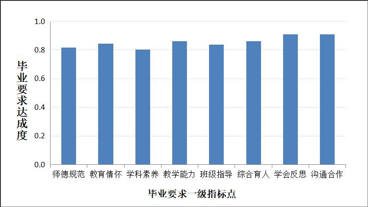立德树人,德育为先,专业通过课堂教育、第二课堂教育等多种途径引导和促进师范生热爱中国共产党、热爱祖国、热爱社会主义,爱岗乐教,立德树人。“师德规范”毕业要求由《思想道德修养与法律基础》、《中国近现代史纲要》、《马克思主义基本原理》、《毛泽东思想和中国特色社会主义理论体系概论》、《教师职业道德专题教育》、《教育学基础》、《教育实习》、《形式与政策》等课程形成高支撑。基于高支撑课程的直接评价,师德规范二级指标1-1、1-2、1-3达成度分别为0.74、0.83、0.81,师德规范一级指标的达成度为0.74。第三方对本专业2020届从事教育工作的毕业生进行了师德规范的调查,毕业生认为师德规范符合度为100%,其中认为“很符合”占比84.52%,用人单位对酷爱成人网 生物科学专业毕业生思想品德与职业道德的满意度为100%,其中“很满意”占比73.33%,达成情况良好。