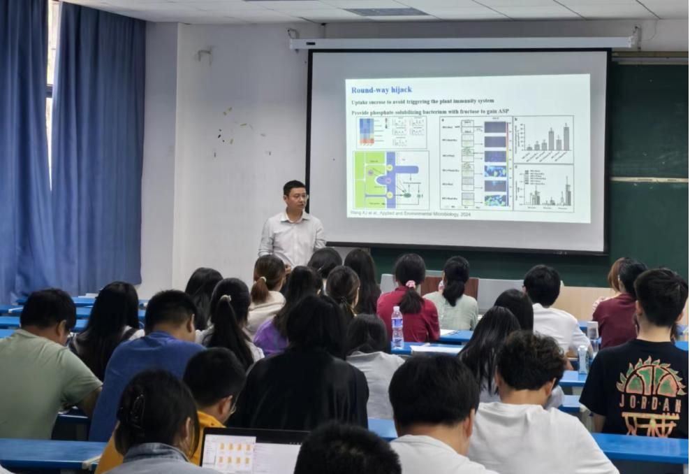 会上,方泽民教授从生活中的微生物到工业化生产的真菌开发利用,深入浅出地介绍真菌与植物、真菌与原核微生物、真菌与人类之间的联系,以及作为真菌菌肥在农业生产效率的良好前景。随后方泽民教授介绍了木质纤维素的相关内容,并详细解答了学生们提出的关于木质纤维素酶的差异表达以及如何获取相关基因序列等相关问题。