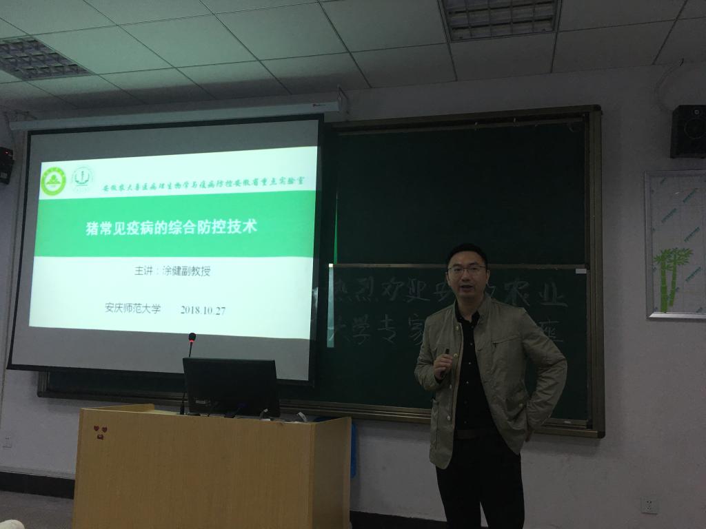 10月27日上午,安徽农业大学涂健副教授应酷爱成人网 邀请来酷爱成人网 作了题为《猪常见疫病防控技术》的学术讲座。讲座由酷爱成人网 院长周多奇主持,动植物检疫专业的师生聆听了报告。